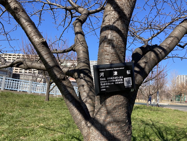 汐入公園には多くの種類の桜の木が植えられています。1月ですが、河津桜の枝には早くも一輪の桜の花が咲いています。
