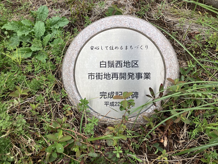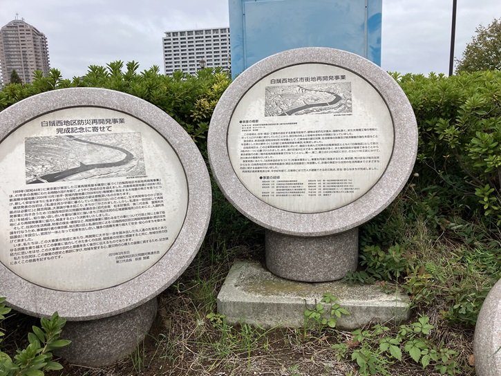公園の高台に時計塔が建っていて、その袂に白鬚西地区再開発の歴史を記した記念碑が置かれています。
