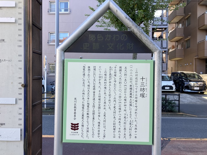 この付近はかつて十三坊塚と呼ばれていた。文政十一年(1828年)刊の「新編武蔵風土記稿」によると、上尾久村に高さ五尺(約150cm)ばかりの塚が四ヶ所、下尾久村に高さ五尺、周囲七・八尺(約210cm・240cm)の塚が八ヶ所あり、それらを「十三坊塚」と呼んだという。この内、下尾久村にあった砂利塚からは太刀と具足が出土したと記されている。この塚は両村の境にあったと思われ、上尾久村には「十三房」という小字があった。十三坊塚は全国に分布し、境界の目安や、村境において災いや疫病・害虫の進入を防ぐ役割を果たしていたものと推測されている。塚は大正六年に旭電化の敷地となって消滅した。「旭電化通り」の名は、この地にあった旭電化工業尾久工場にちなむ。