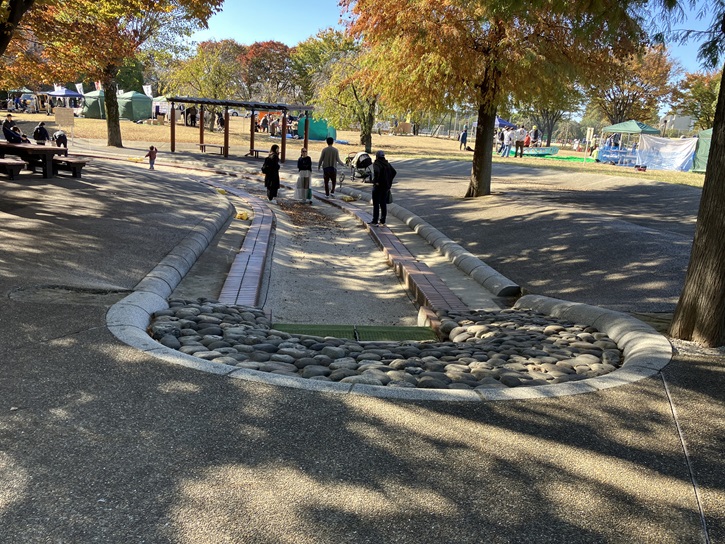 公園を散策します。流れ(じゃぶじゃぶ池)は、毎年7月下旬から8月末頃の夏休みの期間に稼働します。期間中は多くの子供達が遊びに来て、一日中賑わう施設です。