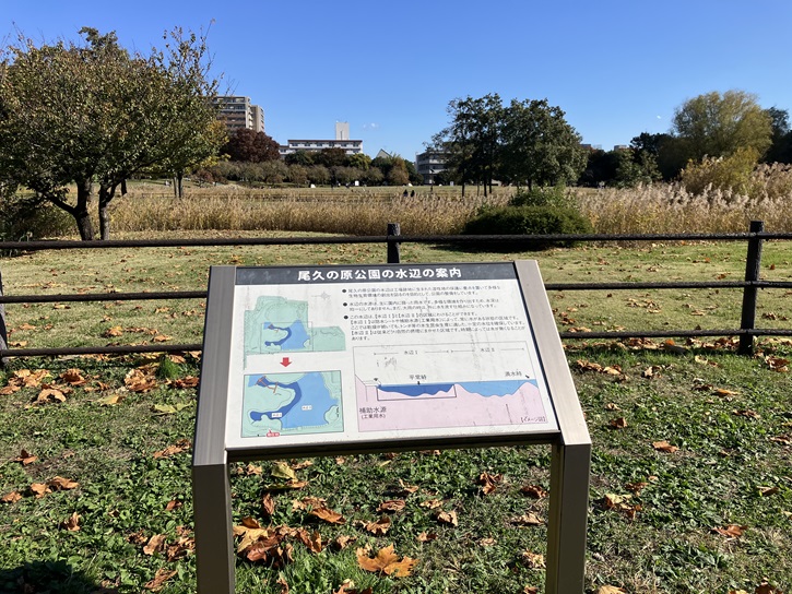 尾久の原公園は、大正時代から続いた旭電化(現:ADEKA)尾久工場跡地に造られた荒川区内では唯一の都立公園です。戦後、東京都が工場跡地を買収し、敷地の東半分が公園として整備され、平成五年(1993年)6月1日に開園しました。敷地面積は約6万u以上あり、サクラ・アシ・チガヤ・ミソハギなど、512本・1、986株の樹木が植樹されています。公園は、豊かな水辺の環境を活かして整備され、雨水が溜まってできた池と湿地の周辺はアシなどの湿生植物が生い茂り、希少植物の生育地となっています。野鳥や約30種類のトンボ、池にはザリガニやカエルなどが生息し、東京都のレッドリストにも掲載されています。また、芝生広場・水辺で遊べる流れ・じゃぶじゃぶ池が整備されていて、遊具などの施設はあまりありませんが、四季折々の自然に触れながら遊ぶことができます。