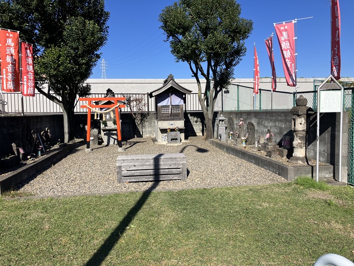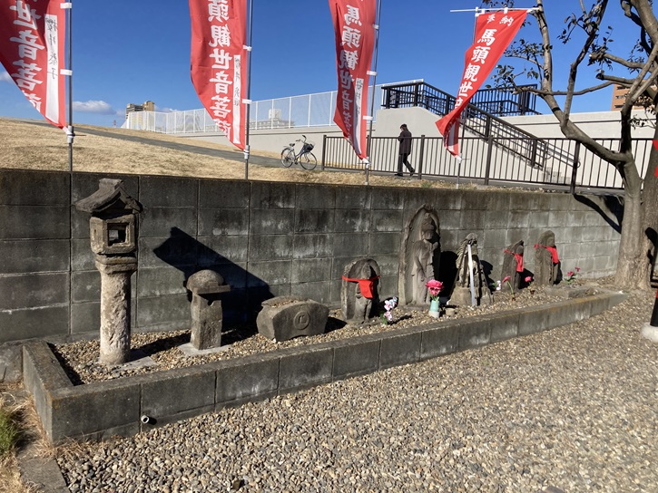 公園と道路を挟んだ先に馬頭観音を祀った祠が並んでいます。かつて、このあたりは秣場(まぐさば)と呼ばれていて、その中に上尾久村の馬捨場がありました。そこに祀られていた馬頭観音や荒川区内最古の庚申塔などがスーパー堤防の建設によって平成十二年(2000年)にこの場所に移設されました。