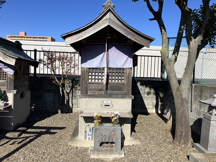 正門左手奥に神社が祀られています。扁額に「・・大明神」と書いてあります。どんな謂れがあるのでしょうか?