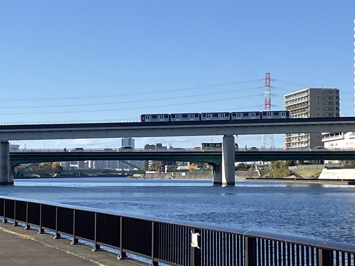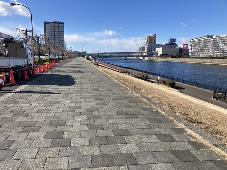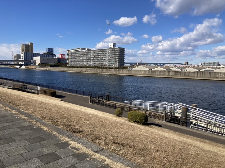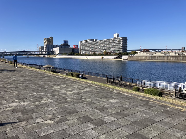 馬頭観音から隅田川の河川敷に降りていきます。隅田川は、街と川辺を直立ではなくなだらかな坂でつなぎ、川沿いをテラスのように歩けるようになっています。このテラスは「隅田川テラス」と呼ばれています。隅田川テラスというと屋形船が通る浅草の辺りが有名ですが、実は隅田川が通る幾つもの区にまたがり、総延長32kmにわたって整備されています。