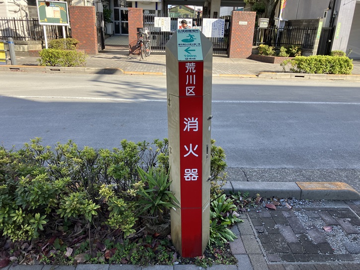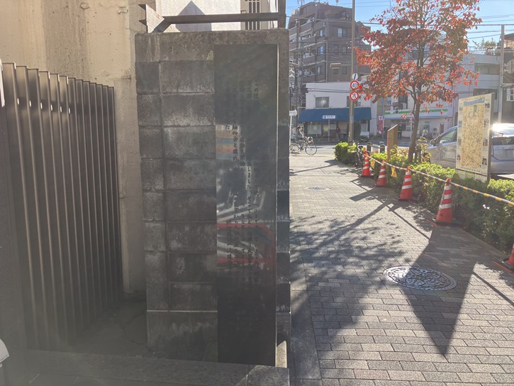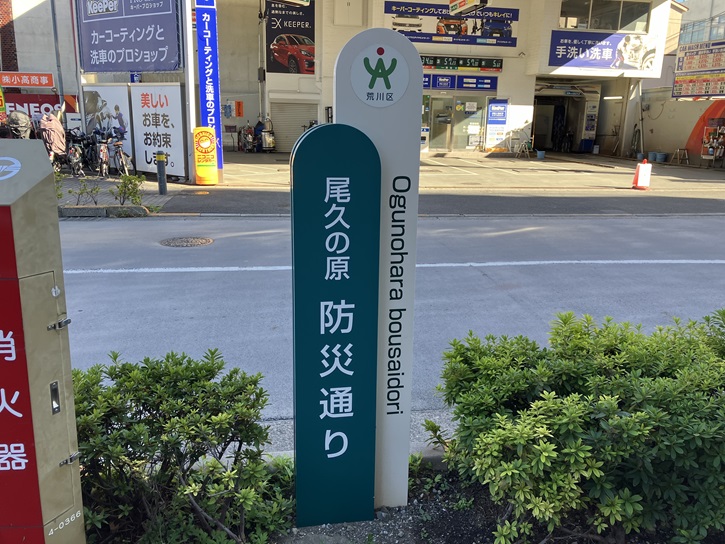 冠新道入口交差点から折り返した直ぐのところに、「消防道路」という石碑が建っています。碑文は読み取れませんが、現在の防災通りは、戦時中に空襲による延焼防止を目的に建物を強制疎開させて造られた疎開道路の跡地を整備したものです。昭和四十八年(1973年)に地元で「消防道路」という名称になり、平成二十四年(2012年)に荒川区が「尾久の原防災通り」と命名しました。