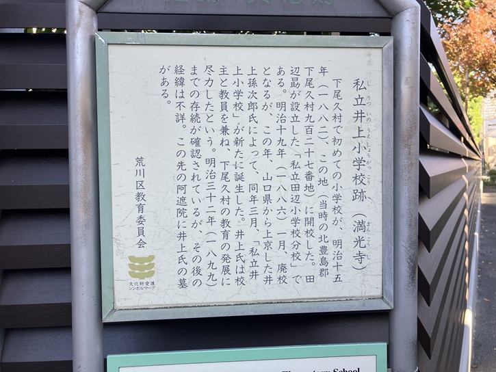 下尾久村で初めての小学校が、明治十五年(1882年)、この地(当時の北豊島郡下尾久村九百二十七番地)に開校した。田辺勗が設立した「私立田辺小学校分校」である。明治十九年(1886年)一月、廃校となるが、この年、山口県から上京した井上孫次郎氏によって、同年三月、「私立井上小学校」が新たに誕生した。井上氏は校主と教員を兼ね、下尾久村の教育の発展に尽力したという。明治三十二年(1899年)までの存続が確認されているが、その後の経緯は不詳。この先の阿遮院に井上氏の墓がある。