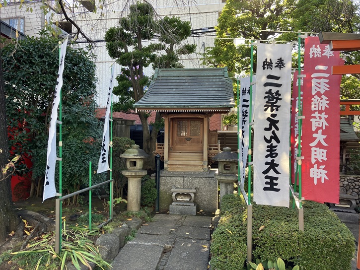 境内の左手には、二羽稲荷大明神と二葉閻魔大王が祀られています。稲荷のみ「葉」ではなく「羽」の字が使われていますが、2枚の羽が組み合わさった満光寺の寺紋「違い鷹の羽」に通じているようです。