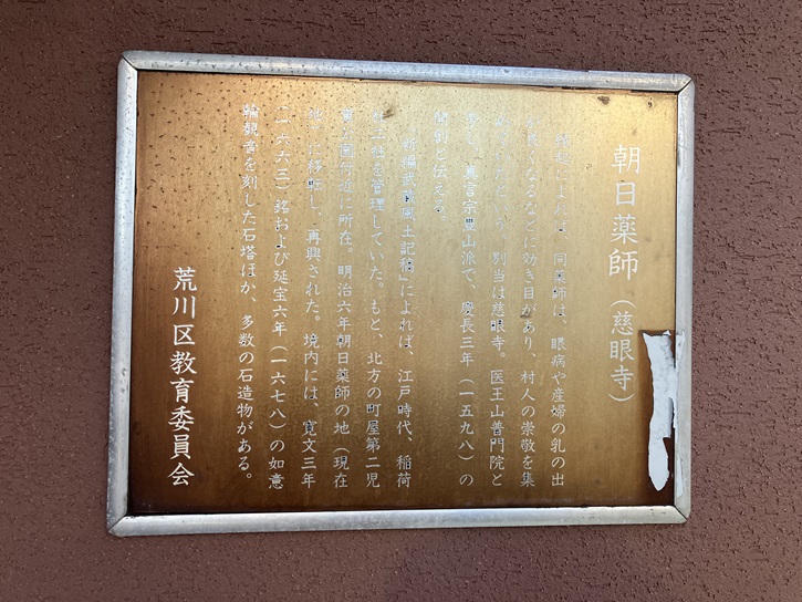 縁起によれば、同薬師は、眼病や産婦の乳の出が良くなるなどに効き目があり、村人の崇敬を集めていたという。別当は慈眼寺。医王山普門院と号し、真言宗豊山派で、慶長三年(1598年)の開創と伝える。「新編武蔵風土記稿」によれば、江戸時代、稲荷社二社を管理していた。もと、北方の町屋第二児童公園付近に所在。明治六年朝日薬師の地(現在地)に移転し、再興された。境内には、寛文三年(1663年)銘および延宝六年(1678年)の如意輪観音を刻した石塔ほか、多数の石造物がある。