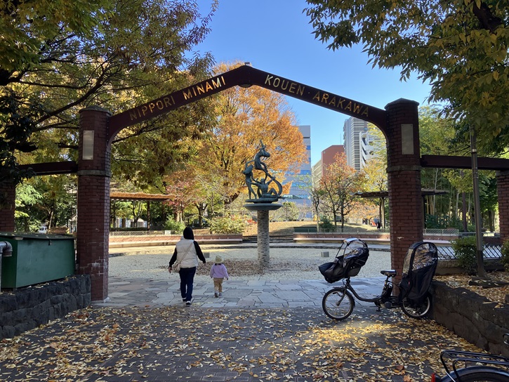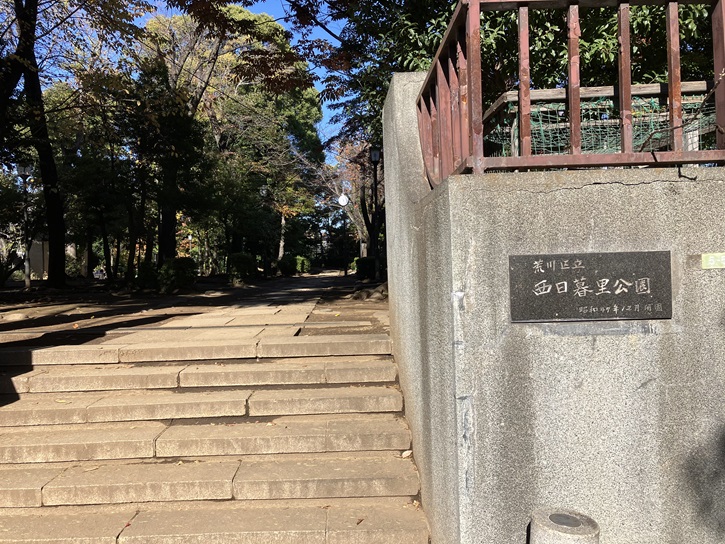 - 今日は荒川区の「E.歴史と文化のルート」を歩きます。荒川区立日暮里南公園をスタート地点として、日暮里繊維街を経て、日暮里の寺町を巡ります。最初に歩いたのは2022年の1月でしたが、記憶が薄れてきましたので2024年11月に改めて歩きました。