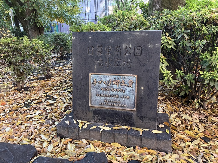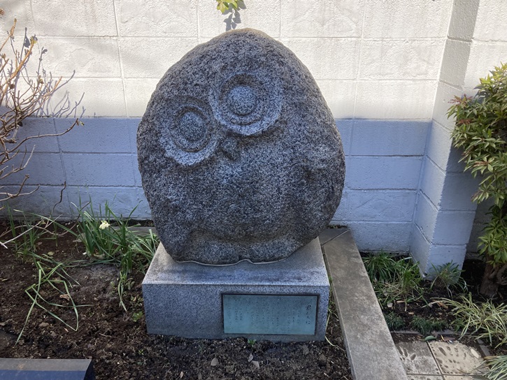 荒川区立第一日暮里小学校校門前に石碑とフクロウの像があります。同校創立百周年の際に造られたもので、石碑「正直親切」は同校卒業の高村光太郎直筆によるものです。