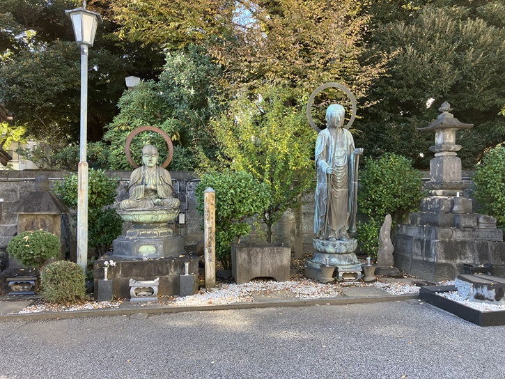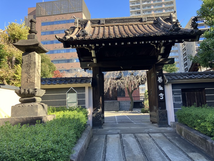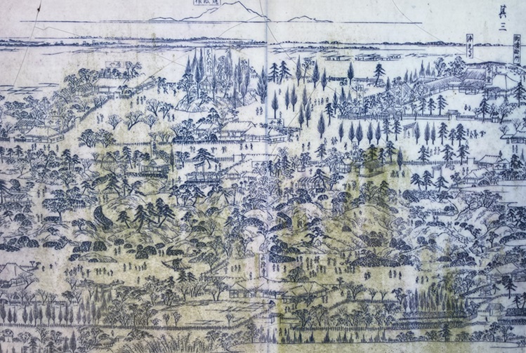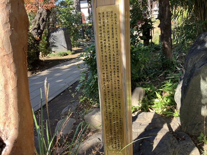 frequenting the temple. It is said that there once was an observation post (Monomiuka) set up by the military commander Ota Dokan (who built the original Edo-Castle), and now commemorated by a stele erected in 1750. There are also graves in the precinct such as Ichikawa Kansai, a Confucianist, Beian (father and son), calligraphers, and Nagai Naoyuki, a statesman active during the late shogunate and the Meiji Restoration.