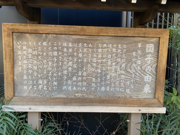 江戸文化開花期の文化文政の頃、遙かな荒川の風光に恵まれたこの辺り日暮しの里は、音無川のせゝらきと小粋な根岸の三味の音もきこえる塵外の小天地でありました。文政二年、小店の初代庄五郎がこゝ音無川のほとり芋坂に「藤の木茶屋」を開業し、街道往来の人々に団子を供しておりました。この団子がきめが細かくて羽二重のようだと称され、そのまゝ菓名となっていつしか商号も「羽二重団子」となり、創業以来今も江戸の風味と面影を承け継いでおります。