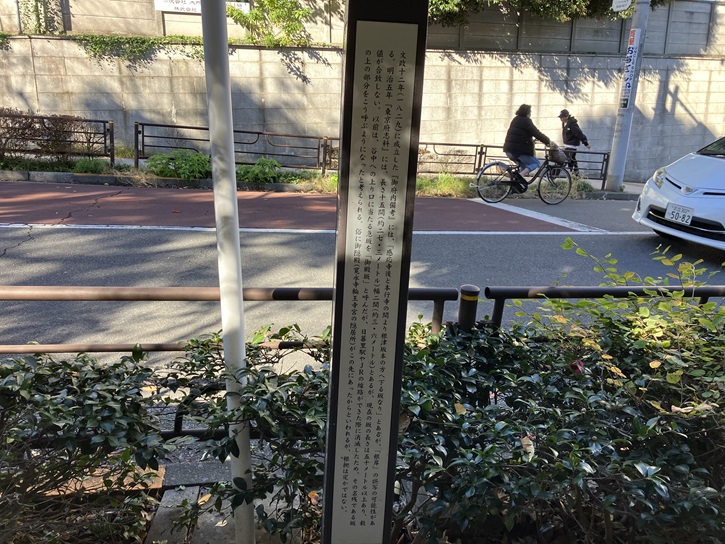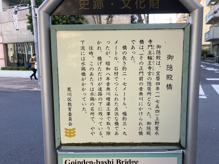 尾久橋通りの東日暮里五丁目交差点の辺りに、先ほど渡った下御隠殿橋と似た名前の「御隠殿橋」の案内板が立っています。かって、ここには音無川が流れていたんですね。
