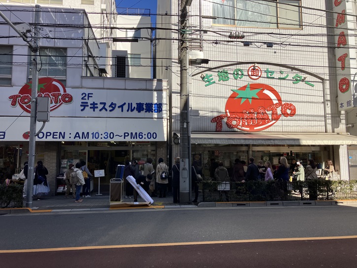 「TOMATO」は、トマト本館・インテリア館・アーチ館・ノーション館・セレクト館の5店舗を展開し、日暮里繊維街の中でも一番規模が大きなお店です。一番人が群がってるのは、1m100円の生地のコーナーです。