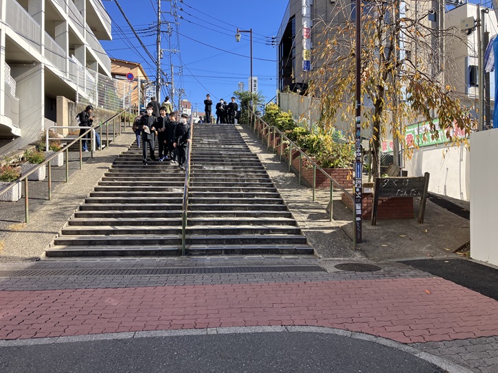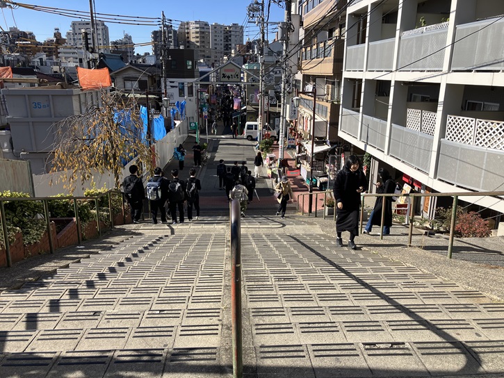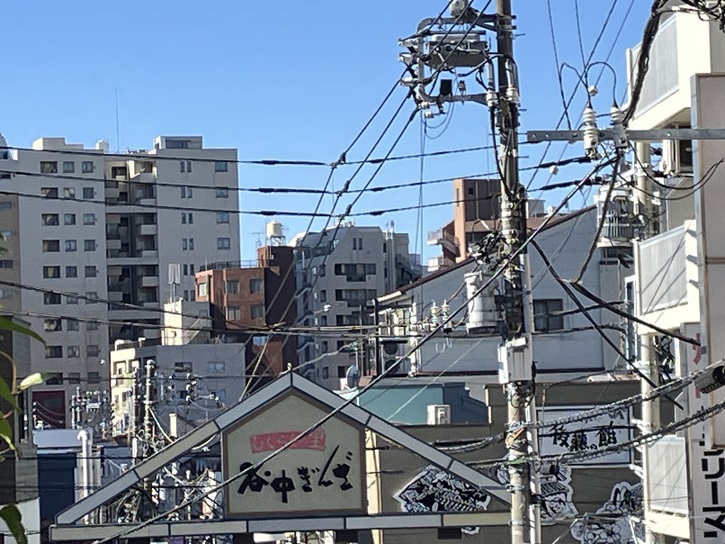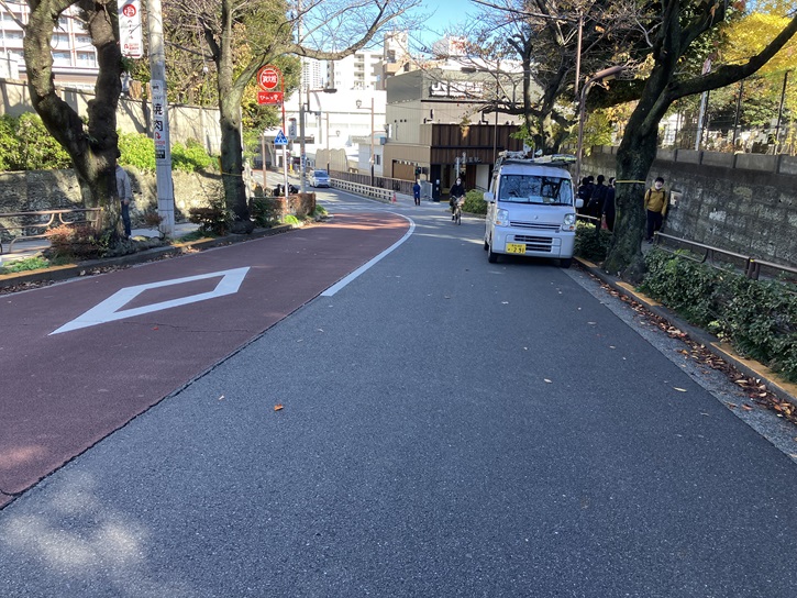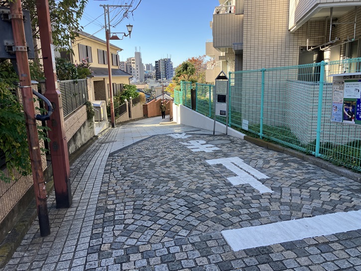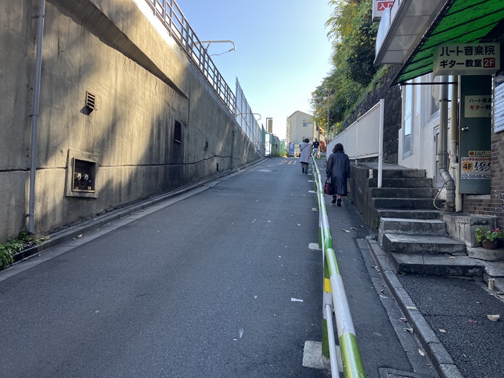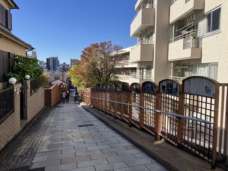 西日暮里駅西口の脇から線路沿いに、諏訪台地にある西日暮里公園の石塀に沿って南に上がる坂があります。間の坂(あいのさか)は。長さは約100mほどで、坂上近くで右方向に直角に曲がっています。