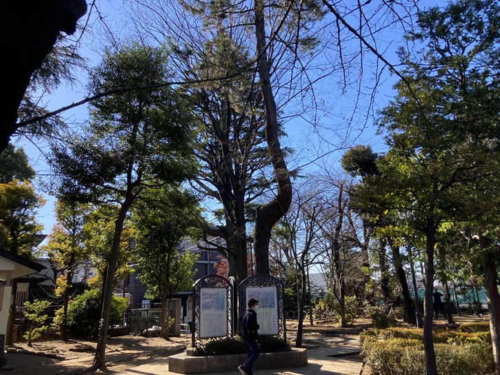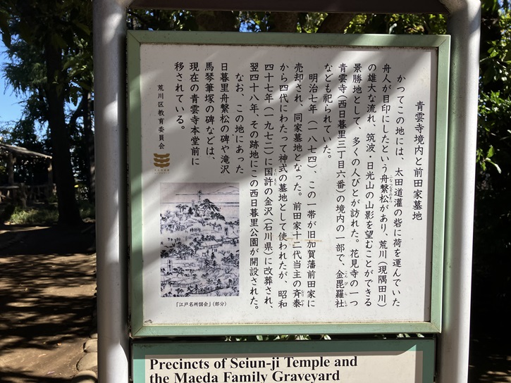 In 1874 the land was sold to Maeda family, ex-lord of Kaga Domain. It was used as the family's Shinto graveyard from the time of the 12th through the 15th head of the family, but in 1972 it was transferred to the Nodayama Cemetery in Kanazawa, Ishikawa Prefecture. And the following year the former graveyard became Arakawa City Nishi-Nippori Park. A number of steles that stood on this site, including the one commemorating the Nippori Funa-tsunagi-no-matsu and Takizawa Bakin's Brush Mound Stele were moved to the site in front of the main hall of Seiun-ji Temple.