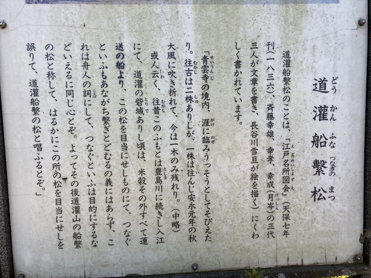 「青雲寺の境内、涯に臨みうっそうとしてそびえたり。往古は二株ありしが、一株は往んじ安永元年の秋大風に吹き折れて、今は一木のみ残れり。(中略)或人云く、往昔このふもとは豊島川に続きし入江にて、道灌の砦城ありし頃は、米穀その外すべて運送の船より、この松を目当にせしものにて、つなぐといふもあながち繋ぎとどむるの義にはあらず、これは舟人の詞にして、つなぐといふは目的にするなどいえるに同じ心とぞ。よってその後道灌山の船繋の松と称して、はるかにこの所の松を目当にせしを誤りて、道灌船の松と唱ふるとぞ。」