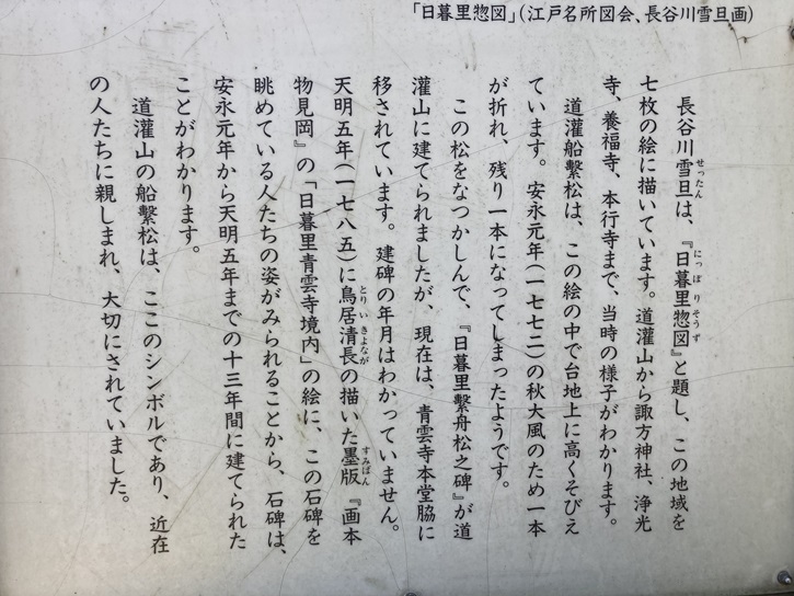 長谷川雪旦は、「日暮里惣図」と題し、この地域を七枚の絵に描いています。道灌山から諏方神社、浄光寺、養福寺、本行寺まで、当時の様子がわかります。道灌船繋松は、この絵の中で台地上に高くそびえています。安永元年(1772年)の秋大風のため一本が折れ、残り一本になってしまったようです。この松をなつかしんで、「日暮里繋舟松之碑」が道灌山に建てられましたが、現在は、青雲寺本堂脇に移されています。建碑の年月はわかっていません。天明五年(1785年)に鳥居清長の描いた墨版「画本物見岡」の「日暮里青雲寺境内」の絵に、この石碑を眺めている人たちの姿がみられることから、石碑は、安永元年から天明五年までの十三年間に建てられたことがわかります。道灌山の船繋松は、ここのシンボルであり、近在の人たちに親しまれ、大切にされていました。