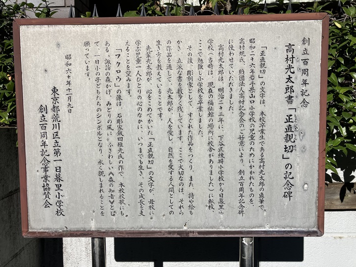 校門の前には、フクロウの像と石碑が建っています。これらは第一日暮里小学校の創立百周年の際に造られたもので、石碑「正直親切」は卒業生の高村光太郎による直筆の揮毫です。第一日暮里小学校の卒業生には、高村光太郎の他に女優の芦田愛菜さんや池波志乃さんもいます。