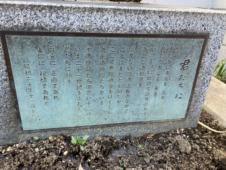フクロウの像の土台には、高村光太郎直筆の「君たちに」と題するプレートが貼られています。
