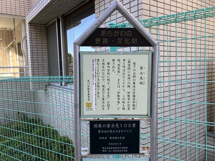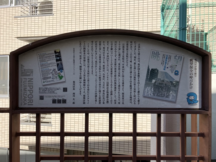 富士見坂は長さが約120mほどのかなり傾斜のきつい坂で、花見坂・妙隆寺坂とも呼ばれています。坂上から富士山を望むことができたためにこの坂名が付けられました。東京には16カ所の“富士見坂”があるといわれています。しかし、高層ビルの建設などにより、実際に富士山が見られる坂は、この「日暮里の富士見坂」と「大塚の富士見坂」の2ケ所のみとなりました。更に、2013年に建てられたマンションによって日暮里の富士見坂からも富士山は見えなくなってしまいました。大塚の富士見坂からの眺望も富士山の全体は見れず、左半分だけとなっています。