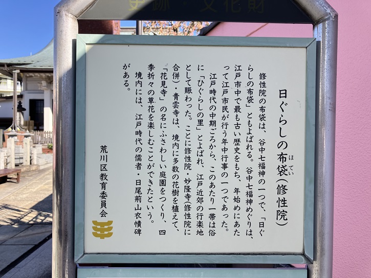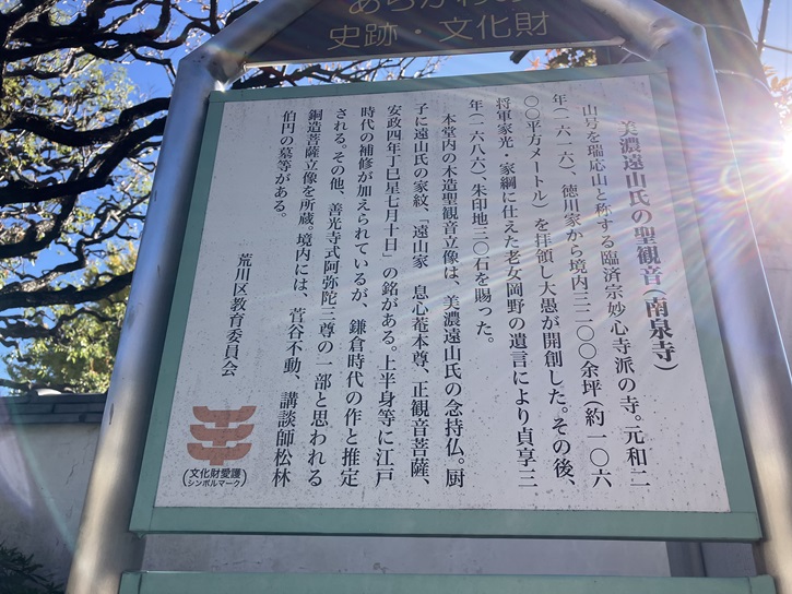 駅前通りを日暮里南公園に向かって進みます。左手に善性寺があり、山門脇に案内板が立っています。