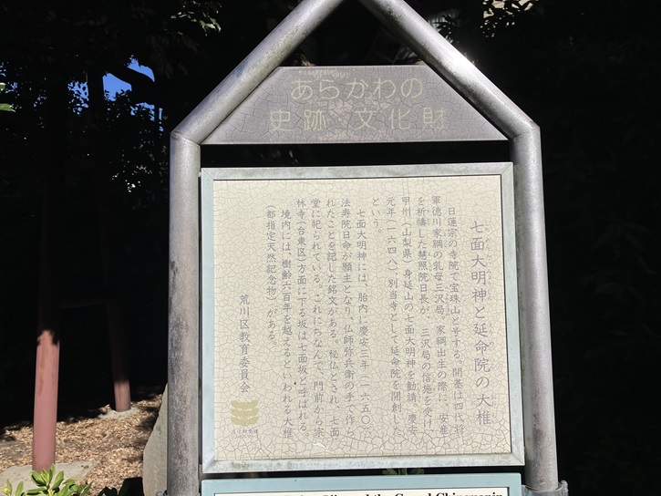 attached to a Shinto shrine (normally temples and shrines are separate). On the inscription on the statue of Shichimen Daimyojin, it is stated that the statue's creation was ordered by Hojuin Nichimyo and sculpted by a priest named Yahe in 1650. The statue is ordinarily kept hidden from view and is enshrined in Shichimen-do Hall. The slope that runs in front of the gate towards Sorin-ji temple (Taito City) is called Shichimen-zaka Slope, named after this shrine. A large chinquapin tree (a designated Tokyo Metropolitan natural treasure stands on the premises and is said to be over 600 years old.