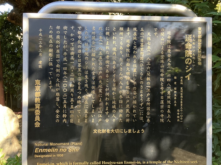 延命院は慶安元年(1648年)、慈照院日長上人の開山による宝珠山延命院と号す日蓮宗の寺院です。天保七年(1836年)開板の「江戸名所図会」巻五の「日暮里惣図(ひぐらしのさとそうず)」には、現在地と思われる位置にシイの姿が描かれています。延命院は七面大明神を祀る江戸庶民の祈願所でもあり、たくさんの人々が参詣に訪れたといわれ、境内にあるシイも当時から地域の人々に親しまれた老樹であることが伺われます。安政二年(1855年)の江戸の大地震によって「江戸名所図会」に描かれた堂宇は倒壊してしまいましたが、延命院のシイは生き残り、現在に至るまで都市化の進む日暮里の姿を見つめ続けています。かつては樹高16.2m、幹周り5.5mの巨樹でしたが、平成十四年(2002年)五月に幹内部の腐朽が原因で南側の大枝が崩落し、安全のため現在の樹形に保っています。