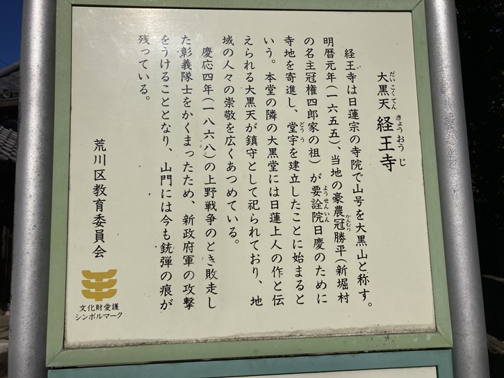 経王寺は日蓮宗の寺院で山号を大黒山と称す。明暦元年(1655年)、当地の豪農冠勝平(新堀村の名主冠権四郎家の祖)が要詮院日慶のために寺地を寄進し、堂宇を建立したことに始まるという。本堂の隣の大黒堂には日蓮上人の作と伝えられる大黒天が鎮守として祀られており、地域の人々の崇敬を広くあつめている。慶応四年(1868年)の上野戦争のとき敗走した彰義隊士をかくまったため、新政府軍の攻撃をうけることとなり、山門には今も銃弾の痕が残っている。