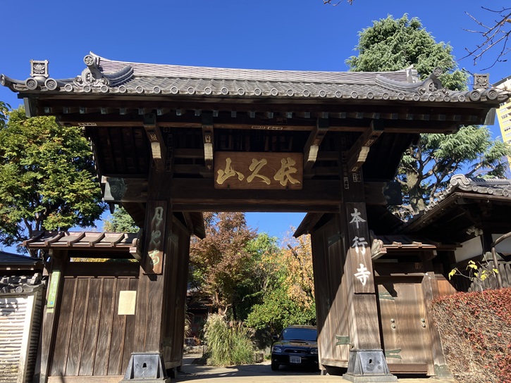 本行寺は山号を長久山と称し、道灌山のつづき道灌丘に在り、月見寺とも呼ばれています。今より四百九十九年の昔、大永六年(1524年)に太田道灌公の孫、太田大和守資高公(天文十六年七月二十四日卒)によって武江城(江戸城)内平河口(現在の平河門、毎日新聞本社辺)に建立され、開山は明禅院日玄上人(永禄八年一月二十一日寂)で、太田家代々の菩提寺として帰依をうけた(宗派は日蓮宗に属している)。三代資高公は武州岩槻に居住し、北条氏綱の婿になって大永四年武江城内に移住した。その後、北条氏の勢力が増大し太田氏は何かにつけ圧迫され、そこで太田一族の勢力を道灌公の昔に返そうと計画したことが「寛政重修諸家譜」にみられます。それによると、「永禄六年の冬、資高の子康資は、弟資行を呼び家臣二十一人を武江城内の番神堂に集めて、北条氏康を討とうと謀議を巡らす。法恩寺の僧日匠が、北条氏の将、武江城代遠山直景に訴え、直景が康資を捕らえようとした時、本行寺の僧日玄が、ひそかに康資に告げて逃がした。」と記されています。命に及ぶところを日玄上人の力で危うく虎口を逃れ、房州里見氏を頼って落ち延びた。これより太田家は、日玄上人を徳として深く帰依したのである。よって本行寺も城内平河口に在ること八十年、慶長十年に神田に移って四十五年、慶安二年谷中清水町に移り六十一年間居て、その後宝永六年(1709年)に現在地の日暮里に移って三百十五年の歳月が経っております(令和六年現在)。頻繁に移転しているのは太田・北条・徳川と江戸における中心勢力移行の影響を受け当山も存続に苦心をしている事が窺えます。谷中清水町から移転したのは上野大仏殿建立によるもので、引料として当山へ六百九十一両、塔頭受泉坊に五十一両、同じく大乗院へ三十両が寺社奉行本多弾正より渡され、替地として1942坪を受けた事が記録に残っています(現在地)。当時の住職は十二世光勝院日忠上人でこの地を選ばれたのは、ここが太田道灌公ゆかりの地(道灌丘)であり道灌公が築いた砦跡(物見塚)あって、月見寺の名の通り高台で眺めも良く精舎建立にふさわしい処であったからです。また上人は、当山移転の大事業を完成し、本堂、書院、庫裡、番神堂、鐘楼、山門、宝塔、五十万部成就の塔、無縁塔などを建立されました。爾来、開山より約五百年の間、世の移り変わりにもかかわらず又、かの戦災にも焼けることなく、今日の隆盛を保っているのは、開山上人以来歴代先師のご遺徳と檀信徒先祖代々うけつがれてきた護持丹精の熱意によるものと感銘にたえません。
