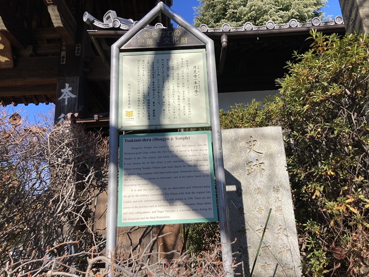 Hongyo-ji Temple was reared in the early 16th century near the Hirakawa-guchi Gate within the Edo Castle. It moved to Kanda then to Yanaka in the 17th century and finally to the current location in 1709. It was famous for its fine views; it was commonly called Tsukimi-dera (Moon-viewing Temple). Nikkan (pen name Ippyo), the 20th chief priest of the temple, kept company with many haiku poets. Kobayashi Issa composed 'Aoi ta no tsuyu wo sakana ya hitorizake', one of his haikus based on his