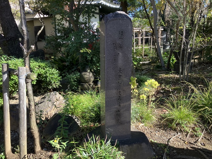 一茶の句碑の向かい側に種田山頭火の「ほっと 月がある 東京に来てゐる」の句碑があります。江戸時代に月見寺と呼ばれた本行寺ならではの句碑です。ちなみに、種田山頭火の句碑は東京では本行寺にしかないそうです。