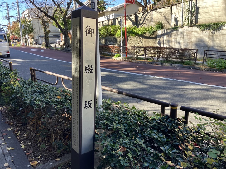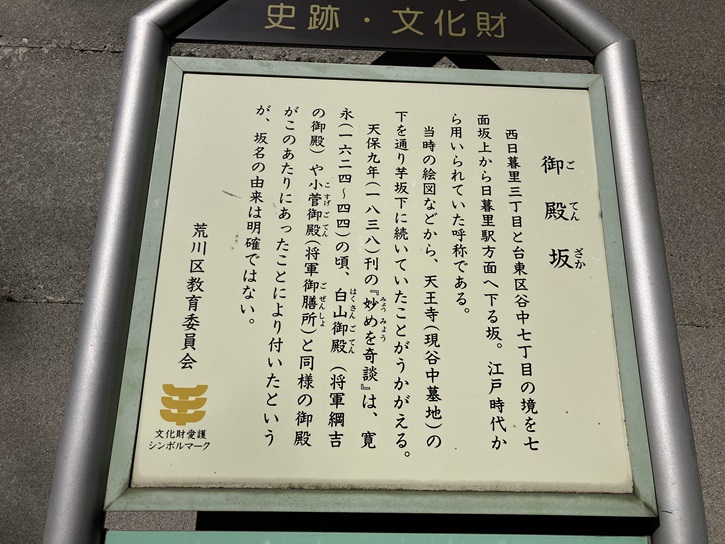 本行寺から日暮里駅に向かって坂が下っています。御殿坂は長さ約180mほどの幅広の坂で、別名を乞食坂といいます。坂名の由来は、「御隠殿」と呼ばれた輪王寺宮の隠居所がこの先にあったからといわれています。この坂を境にして、北側が荒川区、南側は台東区になります。南側の坂下に台東区が設置した案内柱が立っています。