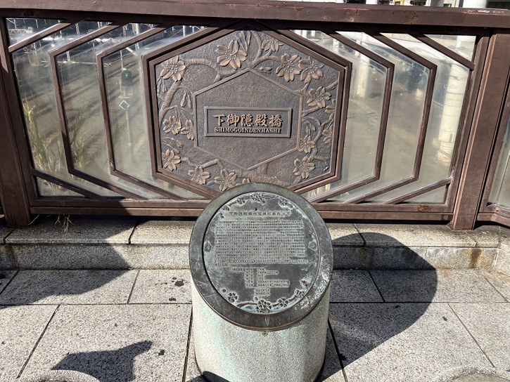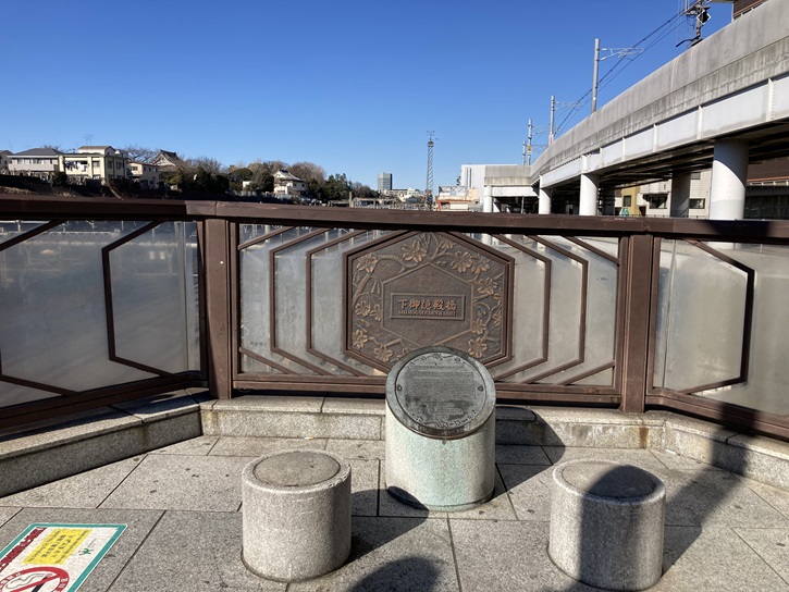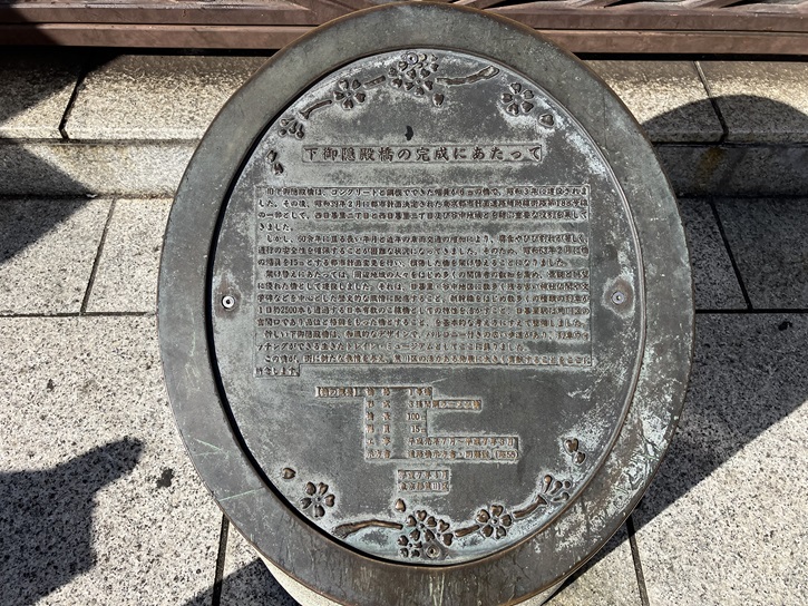 バルコニーの中ほどには、下御隠殿橋とトレインミュージアムの由来を記した案内板が置かれています。