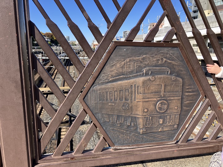 御殿坂の坂下からJR線を跨いで長大な下御隠殿橋が架かっています。下御隠殿橋の中ほどには、トレインミュージアムという愛称のバルコニーが設置されていて、眼下に様々な電車を眺めることができます。