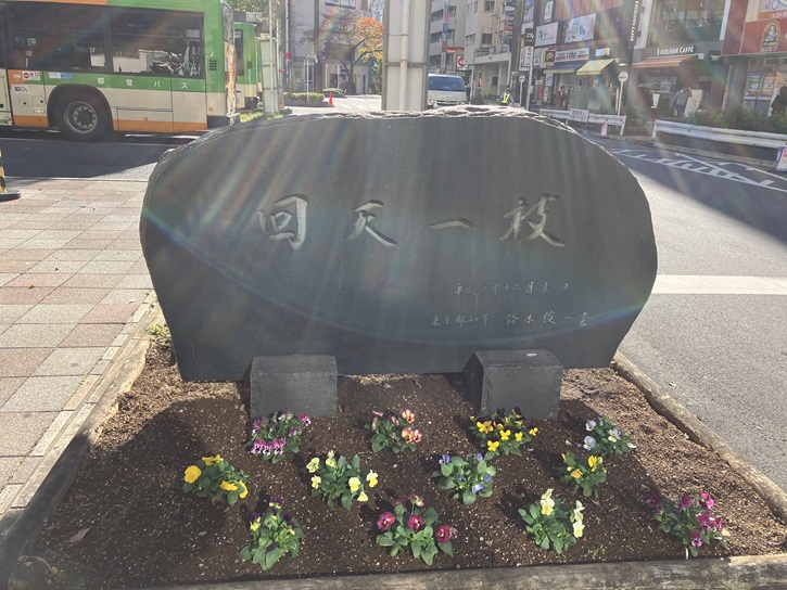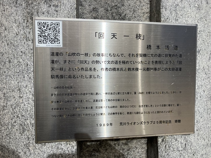 道灌の「山吹の一枝」の故事にちなんで、それを契機に文の道に目覚めた道灌が、まさに「回天」の勢いで文の道を極めていったことを表現しようと「回天一枝」という作品名を、作者の橋本氏と鈴木俊一元都知事がこの太田道灌騎馬像に命名いたしました。