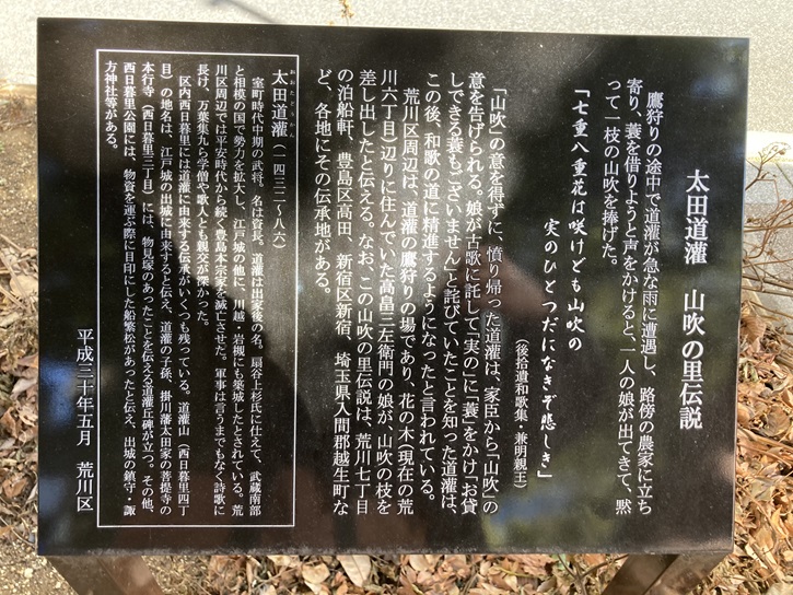 「山吹」の意を得ずに、憤り帰った道灌は、家臣から「山吹」の意を告げられる。娘が古歌に託して「実の」に「蓑」をかけ「お貸しできる簔もございません」と詫びていたことを知った道灌は、この後、和歌の道に精進するようになったと言われている。荒川区周辺は、道灌の鷹狩りの場であり、花の木(現在の荒川六丁目)辺りに住んでいた高畠三左衛門の娘が、山吹の枝を差し出したと伝える。なお、この山吹の里伝説は、荒川七丁目の泊船軒、豊島区高田、新宿区新宿、埼玉県入間郡越生町など、各地にその伝承地がある。
