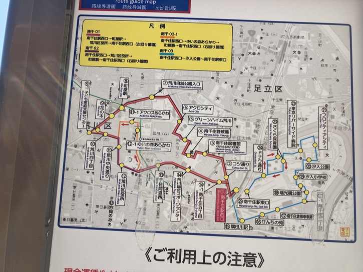 スタート地点の荒川区コミュニティバス[さくら]の南千住駅西口バス停から歩き始めます。運行ルートは2通りあって、今日は「南千01」の左回り循環コースの道筋を歩きます。