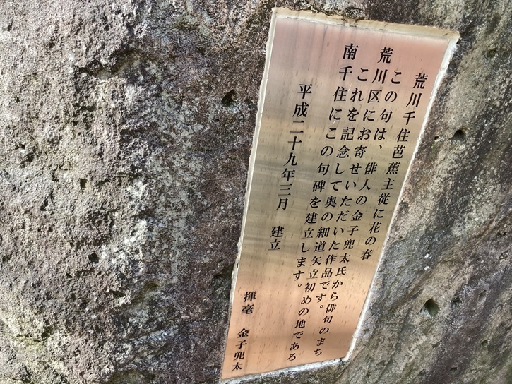 この句は、俳人の金子兜太氏から俳句のまち荒川区にお寄せいただいた作品です。これを記念して奥の細道矢立初めの地である南千住にこの句碑を建立します。