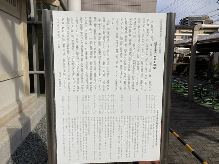 この套堂(さやどう)は、昭和八年(1933年)に橋本左内の墓(区登録有形文化財<歴史資料>)を保護する(納める、覆う)ために造られた建造物です。大正十二年(1923年)の関東大震災後に耐震性と不燃性の観点から注目されるようになった鉄筋コンクリート造で、規模は方一間(柱間1.94メートル)、宝形造の屋根、軒裏および柱・梁等の軸部には、表面に人造擬石洗出・研出仕上げを施しており、伝統的な建築の意匠と近代的工法との折衷を図った近代仏教建築といえます。もとは回向院(南千住五丁目)境内入口にありましたが、平成十八年、套堂のみ区に寄贈され、同二十一年、ここに復元されました。当時、套堂の施主となったのは、橋本左内を追慕し、遺徳を広く発揚することを目的として、明治三十五年(1902年)に設立され