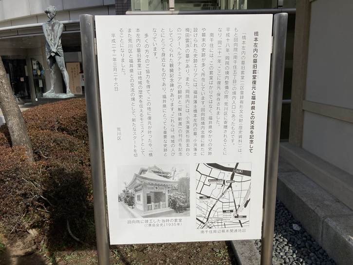 「橋本左内の墓旧套堂」(区登録有形文化財<歴史資料>)は、もと回向院(南千住五丁目)の境内入口にあったものです。平成十八年、同院の境内整備の際、荒川区に寄贈されることになり、同二十一年、ここに復元・保存されました。南千住には、この套堂ばかりではなく、福井県ゆかりの史跡や幕末の史跡が多く所在しています。回向院境内北側に新たに設けられた史跡エリアには、福井藩士橋本左内の墓、小浜藩士梅田雲浜の墓があり、また、同院内には、小浜藩医杉田玄白らの「ターヘルアナトミア」の翻訳と「解体新書」の刊行を記念してつくられた観臓記念碑があります。これらは、地域の人びとにとって身近なものであり、福井県にとっても重要な史跡となっています。多くの方々のご協力を得て、この地に復元が叶った今、「橋本左内の墓旧套堂」は地域の歴史を伝えるモニュメントとして、また荒川区と福井県との交流の場として、新たなスタートを切ることになりました。
