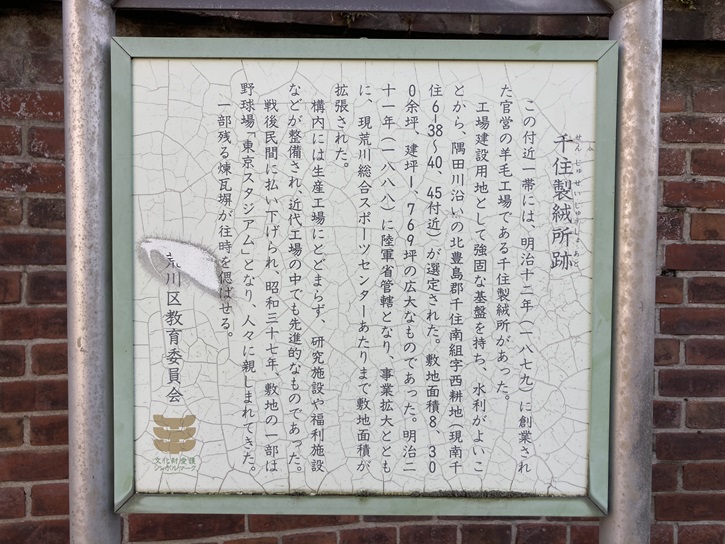 この付近一帯には、明治十二年(1879年)に創業された官営の羊毛工場である千住製絨所があった。工場建設用地として強固な基盤を持ち、水利がよいことから、隅田川沿いの北豊島郡千住南組字西耕地(現南千住6−38〜40、45付近)が選定された。敷地面積8、300余坪、建坪1、769坪の広大なものであった。明治二十一年(1888年)に陸軍省管轄となり、事業拡大とともに、現荒川総合スポーツセンターあたりまで敷地面積が拡張された。構内には生産工場にとどまらず、研究施設や福利施設などが整備され、近代工場の中でも先進的なものであった。戦後民間に払い下げられ、昭和三十七年、敷地の一部は野球場「東京スタジアム」となり、人々に親しまれてきた。一部残る煉瓦塀が往時を偲ばせる。