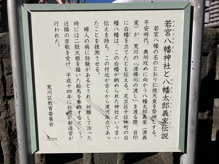 It is said that, in the Heian period, when Hachimantaro Yoshiie (Minamoto no Yoshiie) crossed the Arakawa River during the march to suppress the Oshu rebellion, he placed a white flag here to spot the river crossing. This leads us to believe that this area was a crossing point since olden times. This shrine is known for curing women's illnesses if people pray. Therefore, it became customary to dedicate votive tablets (ema) depicting forked radish if a woman's illness was healed after praying. In 2002, the shrine was rebuilt with reverence and cooperation from local people.