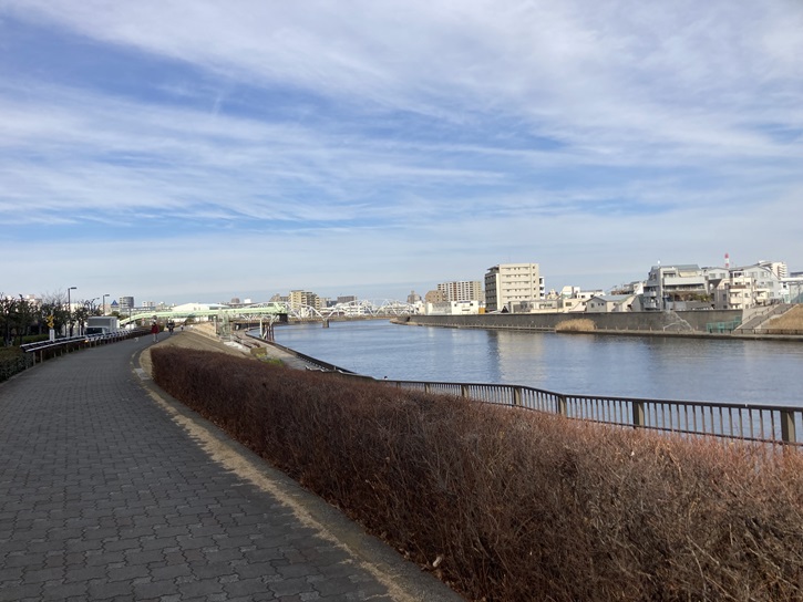 隅田川の土手に突き当たったところで左折します。この付近の護岸はスーパー堤防と呼ばれています。