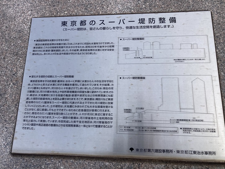 土手の上にスーパー堤防の案内碑があります。