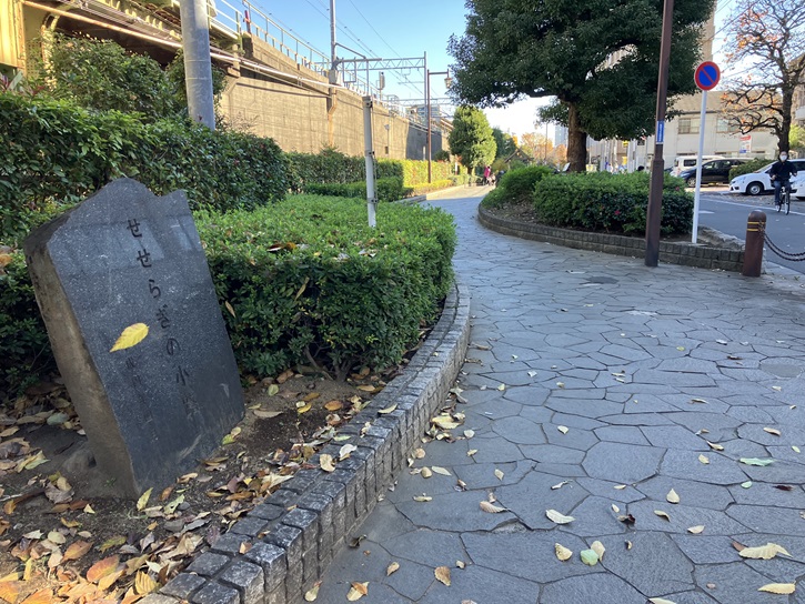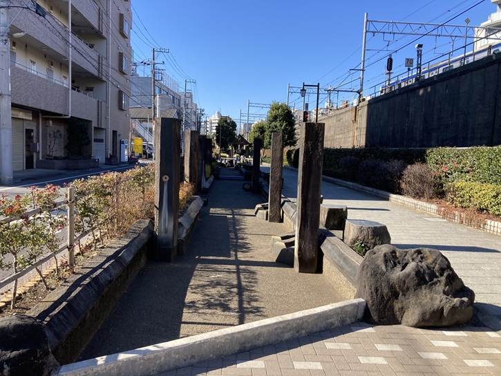 三河島駅南側に隣接して「せせらぎの小路」という愛称の緑道があります。高架の線路と道路に挟まれた細長い公園で、せせらぎが流れる水路が作られています(現在は水は流れていないようですが)。