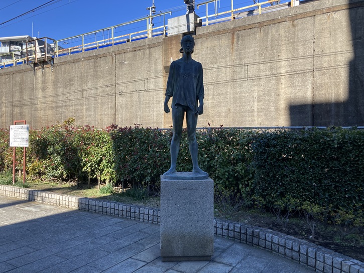 緑道の中ほどに「BLACK uniform」というタイトルの少女像が建っています。この作品は荒川区縁の彫刻家の浦山一雄氏の作品です。せせらぎの小径は山・村・町の3つのエリアで構成されていて、この像は町のエリアに設置されています。