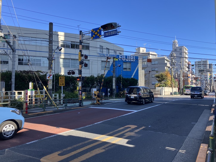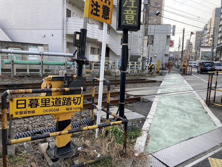 道灌山通りは、日暮里道踏切で常磐線貨物線と平面交差します。旅客線と比べて運転本数の少ない貨物線は高架化されることなく、現在まで平面の踏切が残ったのです。