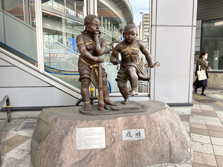 「飛翔」は、平成五年に、東京荒川ライオンズクラブが創立30周年を記念し、区内在住の彫刻家であり荒川区顧問である平野千里氏に依頼して制作し、区に寄贈されたブロンズ像です。二体のブロンズ像は、不動明王に従う童子をモチーフとし、悪事災難を取り除き、あらゆる困難を打ち破る武具として、男の子は「金剛棒」、女の子は「三鈷杵(さんこしょ)」、「輪宝(りんぼう)」を手にしています。「力強さ」や「知恵」、「思いやり」を表現している童子達に未来を担う子供達の成長への願いが込められています。
