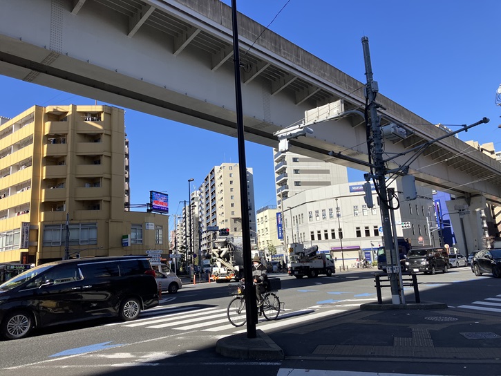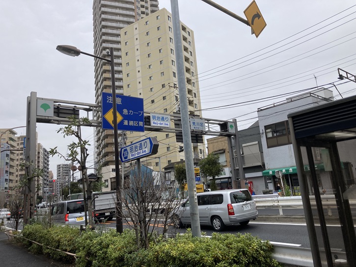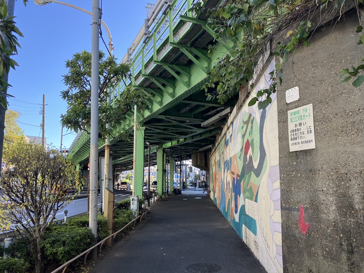 大関横町バス停のすぐ先で、常磐線の高架橋が明治通りを斜めに横断しています。
